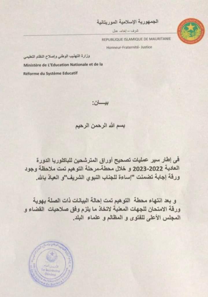 في إطار سير عمليات تصحيح أوراق المترشحين للباكلوريا الدورة العادية 2022- 2023، وخلال محطة – مرحلة التوهيم – تمت ملاحظة وجود ورقة إجابة تضمنت “إساء للجناب النبوي الشريف” والعياذ بالله.