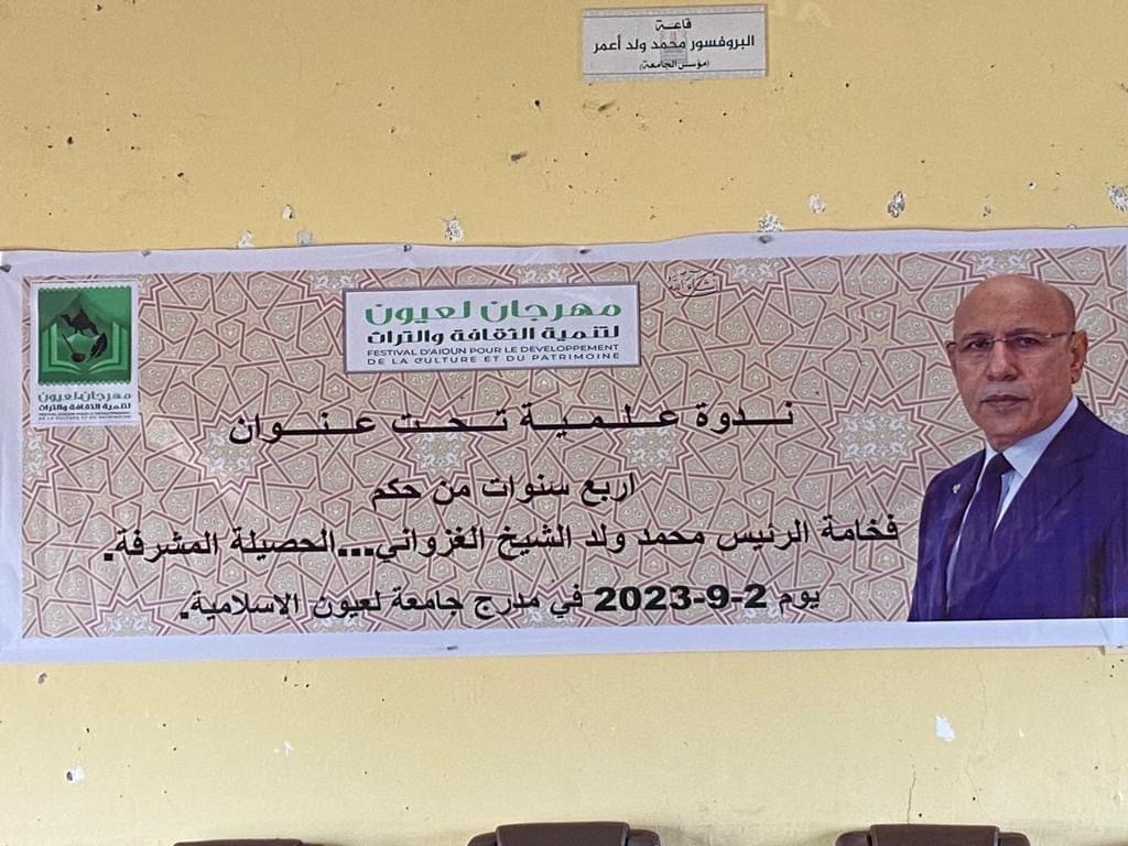 ضمن الأنشطة العلمية لمهرجان لعيون لتنمية الثقافة والتراث، نُظِّمت صباح اليوم بجامعة لعيون الإسلامية ندوة علمية تحت عنوان: أربع سنوات من حكم فخامة رئيس الجمهورية محمد ولد الشيخ الغزواني (الحصيلة المشرفة)،؛ وذلك بحضور رئيس مهرجان لعيون لتنمية الثقافة والتراث السيد المختار ولد اغوزير.