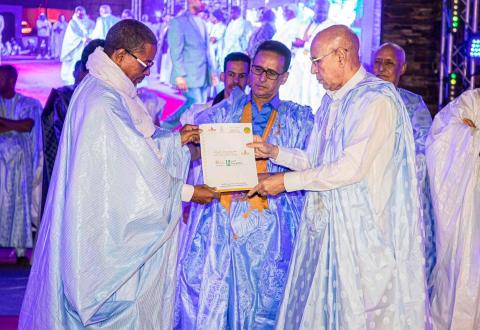 كرم الرئيس محمد ولد الغزواني الفائزين بجائزة الرئيس للفنون الجميلة، على هامش السهرة الفنية الأولى البارحة لمهرجان مدائن التراث بمدينة ولاته.
