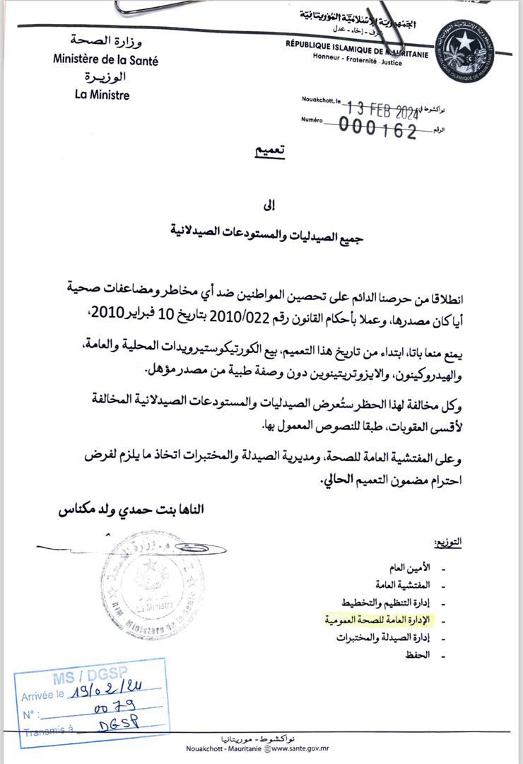 أصدرت وزارة الصحة الموريتانية، تعميما بمنع بيع مواد، الكورتيكوستيرويدات، والهيدروكينون، والايزوتريتينوين، دون وصفة من “مصدر مؤهل”.