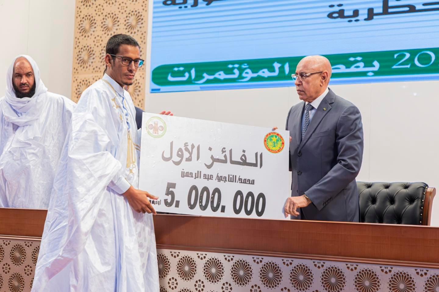 وقد سلّم فخامة رئيس الجمهورية الجائزة الأولى في المسابقة التي تبلغ 5.000.000 أوقية قديمة، للسيد محمد الناجي عبد الرحمن.