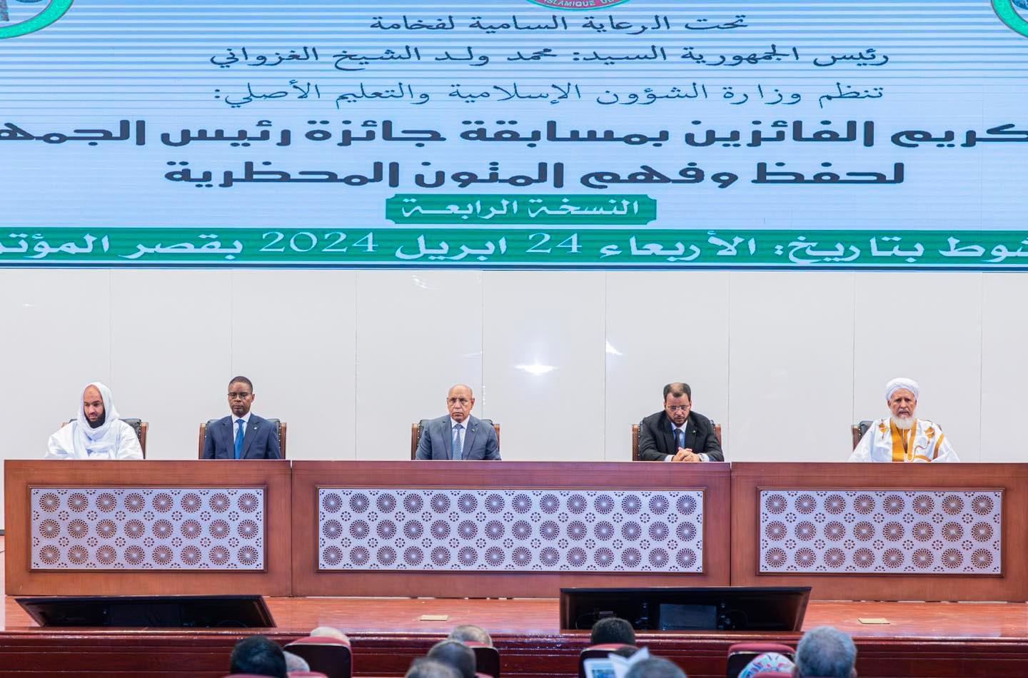أشرف فخامة رئيس الجمهورية، السيد محمد ولد الشيخ الغزواني، صباح اليوم الأربعاء بقصر للمؤتمرات في انواكشوط، على حفل توزيع جوائز النسخة الرابعة من مسابقة جائزة رئيس الجمهورية لحفظ وفهم المتون المحظرية.